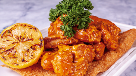 Camarones y salmón rebozados y fritos bañados con un aioli de chile calabrese.