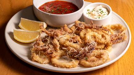 Ricos calamares empanizados acompañados de salsa pomodoro y decorados con queso parmesano.